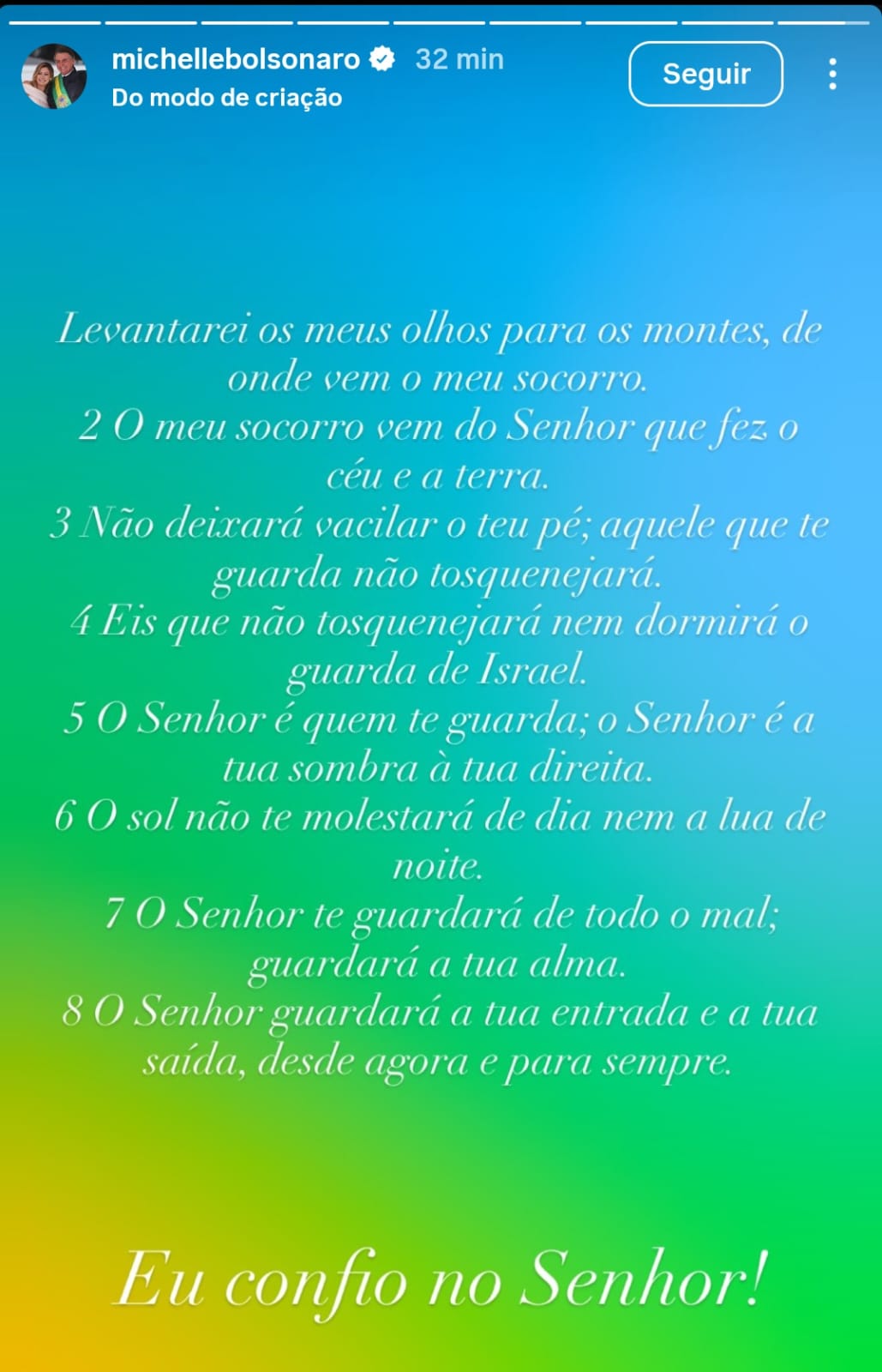 Em seu perfil no Instagram, Michelle postou um trecho do Salmo 121:1-8 que diz: