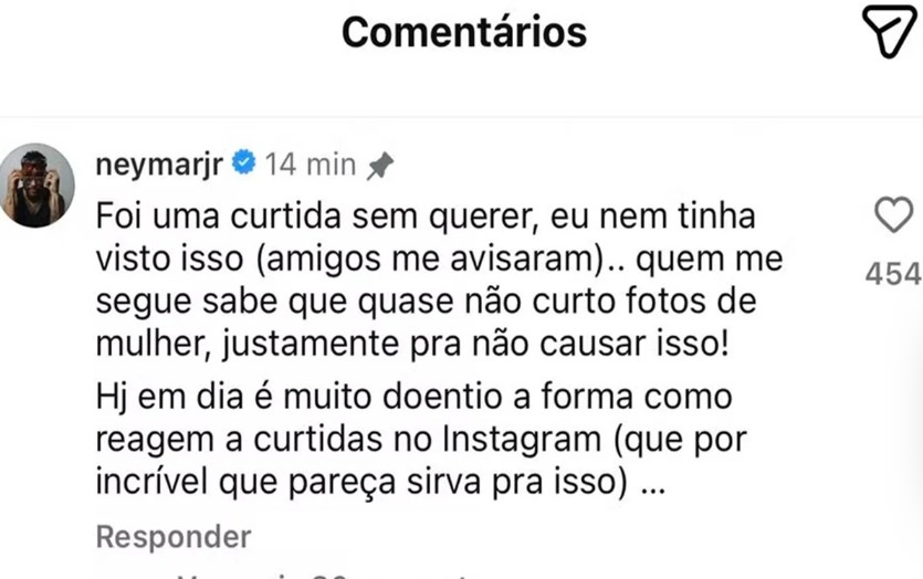 Diante da repercussão, Neymar decidiu comentar o caso e afirmou que a curtida foi acidental.